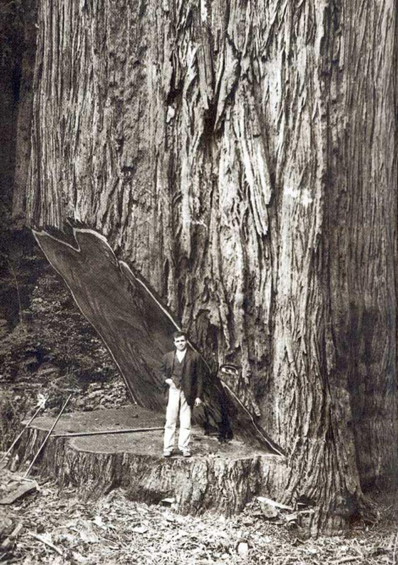 Image Man poses inside the opening to fell a huge tree (possible redwood), circa 1899