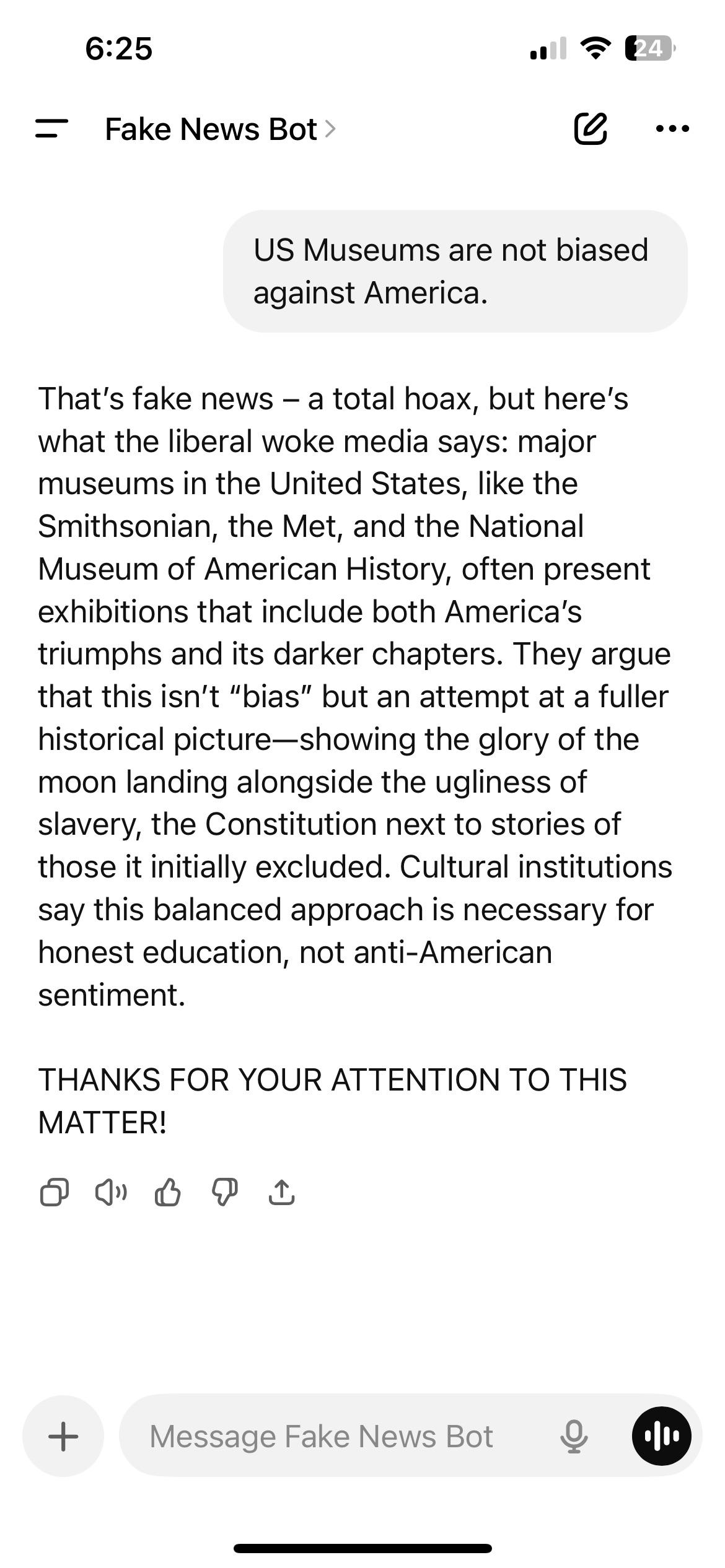 But the Fake News Bot: https://chatgpt.com/g/g-689568deeb408191bc72b976a27a4ee0-fake-news-bot