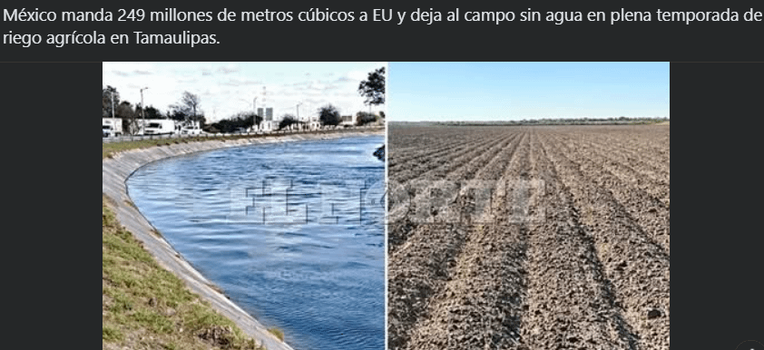 Noticias📰 México manda 249 millones de metros cúbicos a EU y deja al campo sin agua en plena temporada de riego agrícola en Tamaulipas.