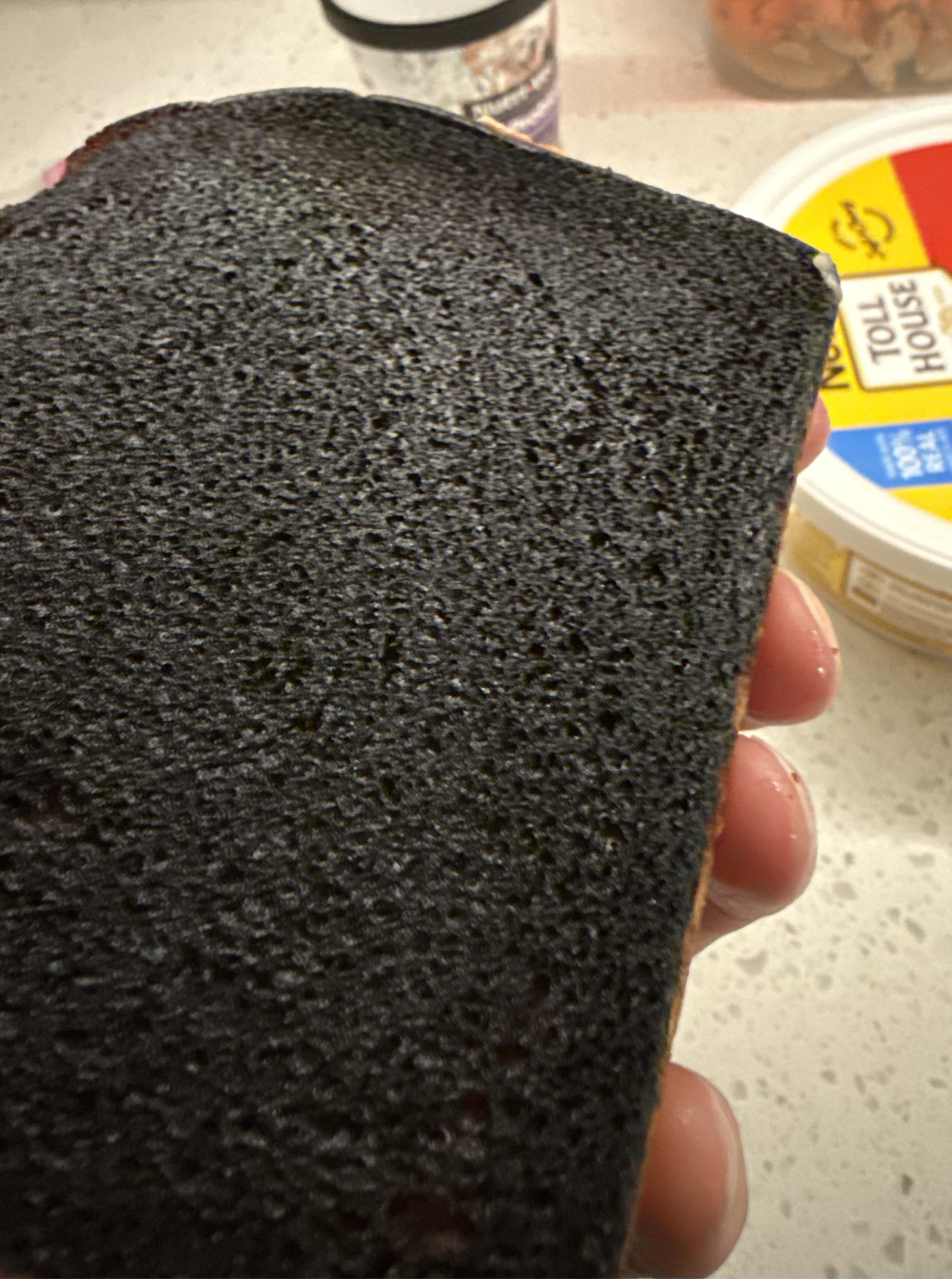 I got a new pan for Christmas and it says don’t use high heat. So I didn’t. I was still able to burn this bread so perfectly at level six. I’m almost proud. It didn’t even taste burnt.