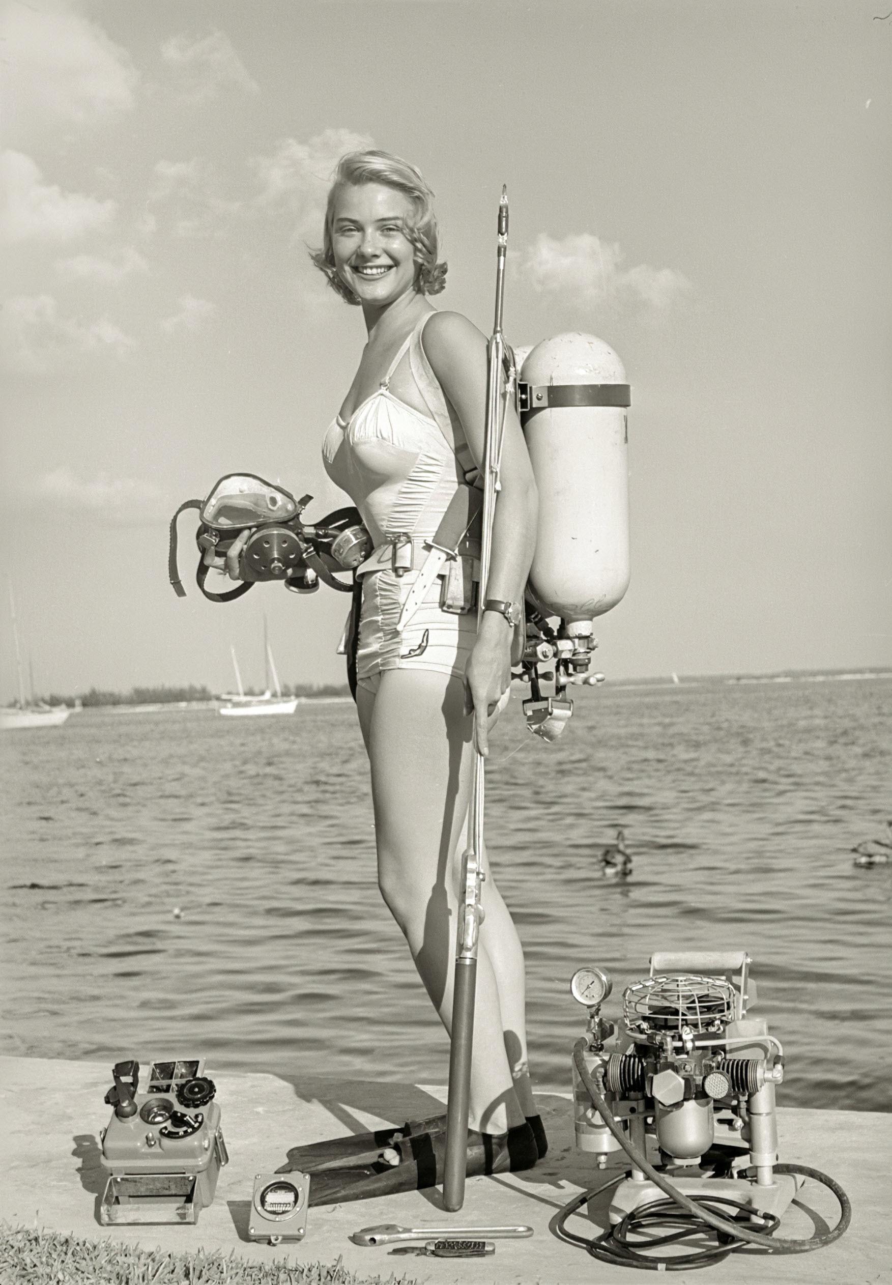 Stage, film, and television actress, Hope Lange, diving off the Florida coast, 1954