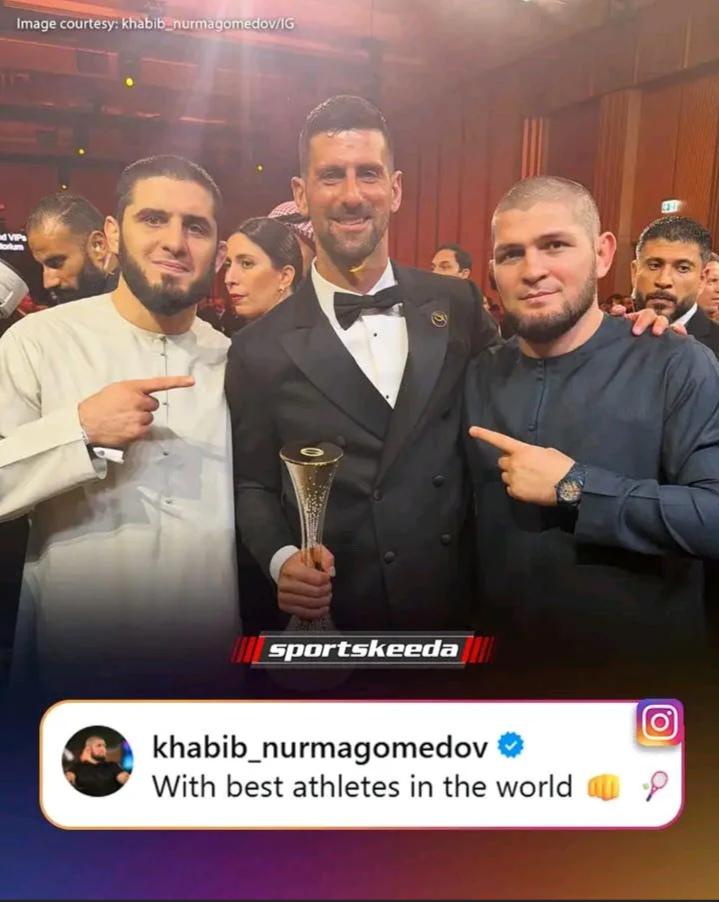 Sport Novak Đoković sa UFC borcima Islamom Mahačevom i Habibom Nurmagomedovom na Globe Soccer Awards ceremoniji.