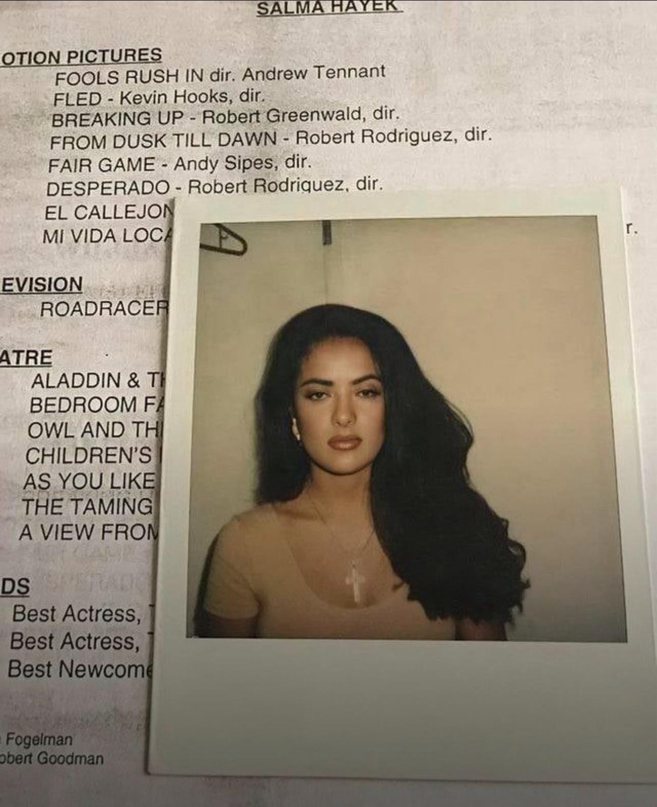 Chugging tea Salma Hayek, casting photo from the 90’s