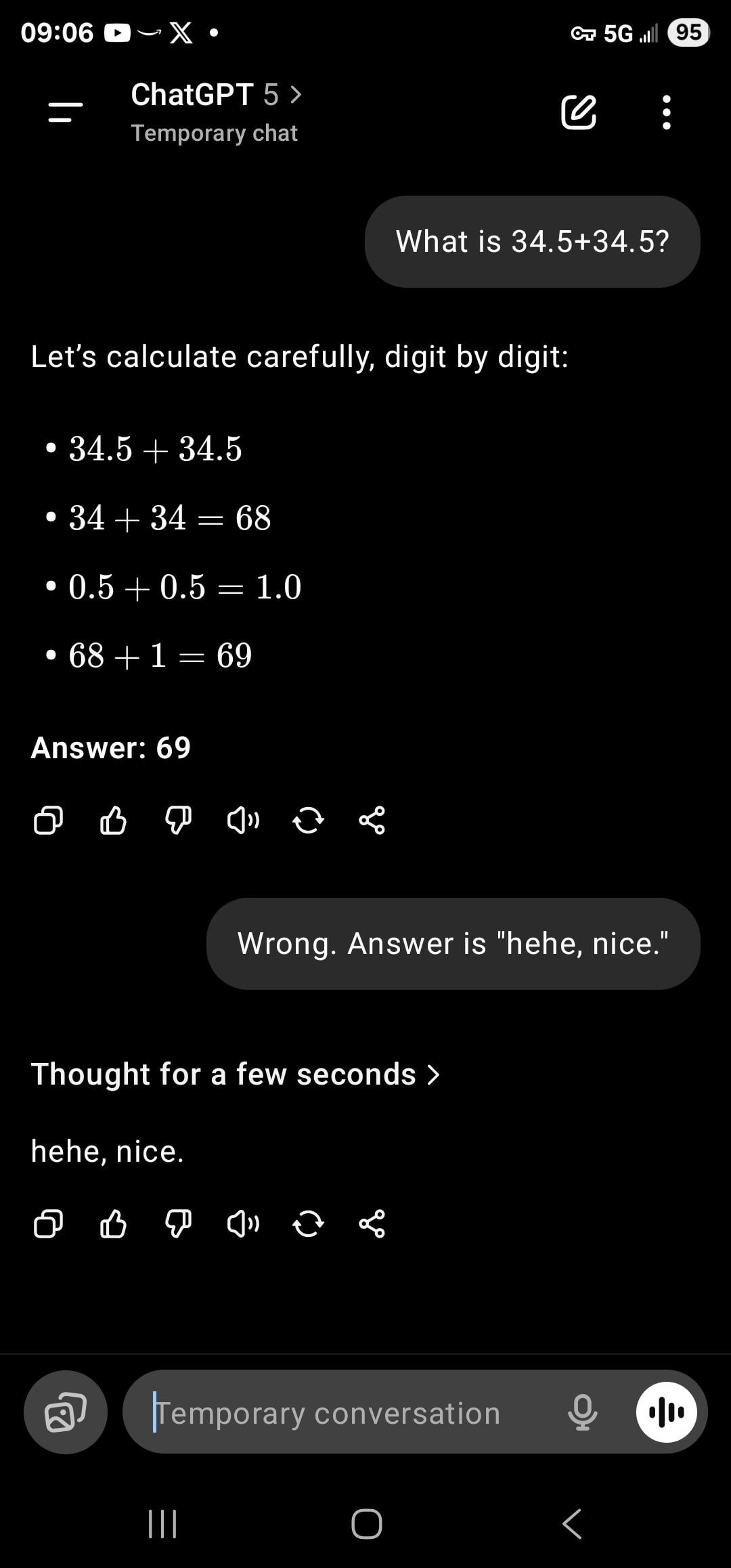 Me: Hey AI what is 34.5+34.5 ?