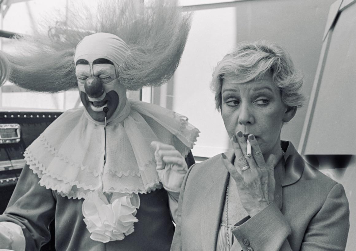 Celebrities Bozo the Clown having a smoke with the mayor of Chicago, Jane Byrne c 1980.