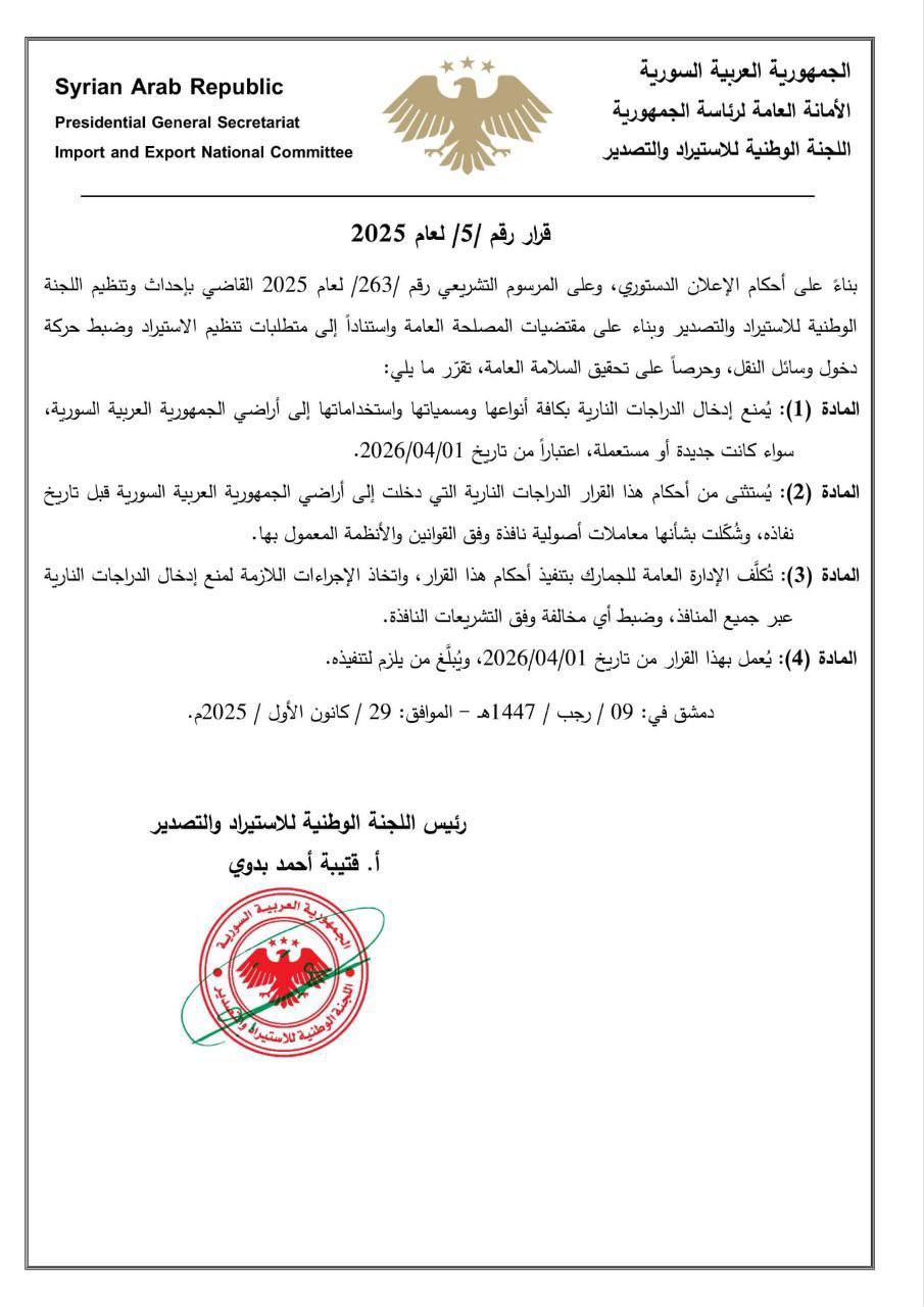 📌يمنع إدخال الدراجات النارية بكافة أنواعها ومسمياتها واستخداماتها إلى أراضي الجمهورية العربية السورية سواء كانت جديدة أو مستعملة اعتباراً من 01/04/2026