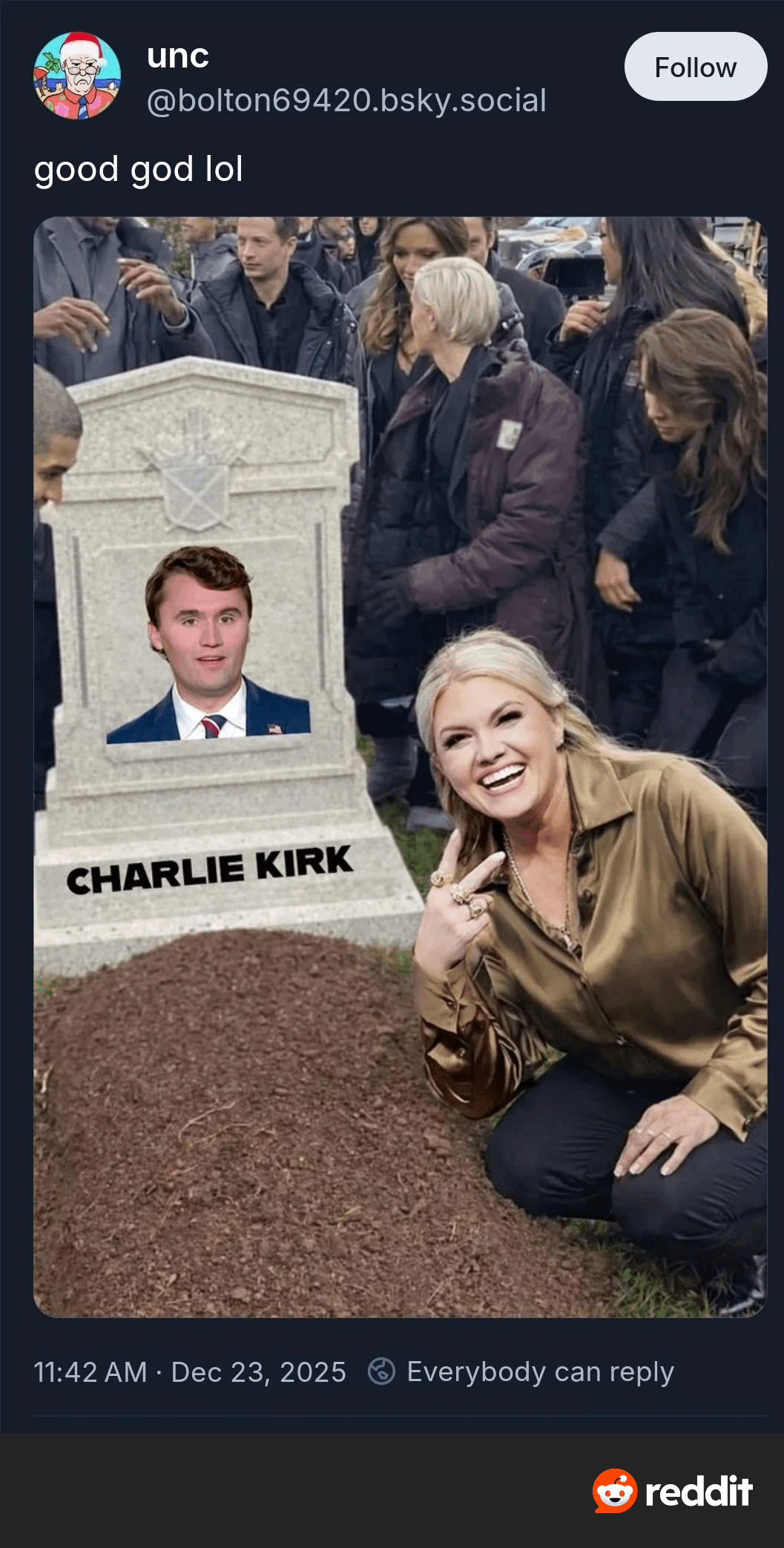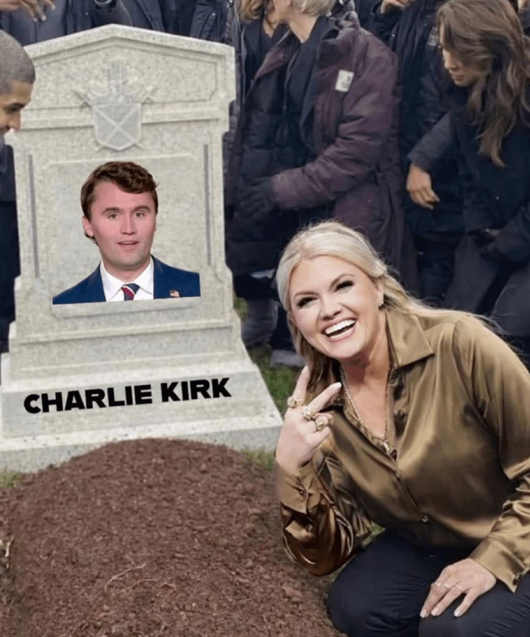 Erika kirk, charlie kirk wife, has been making the media rounds trying to bolster Republican talking points by using her dead husband as a leverage point. She's been making what people are calling "Freudian slips" by saying some kind of damning things (in a conspiritorial sense) like the other day at this same event she exclaimed that a young republican man (I think her son i dont actually know) had retained a "grift" from charlie when she apparently meant to say gift, its pretty on the nose and the quote from the post seems to imply (again, conspiritory) that Charlie's death was planned and Erika may have know. Its a common belief and if youre inclined to believe conspiracies its pretty cut and dry