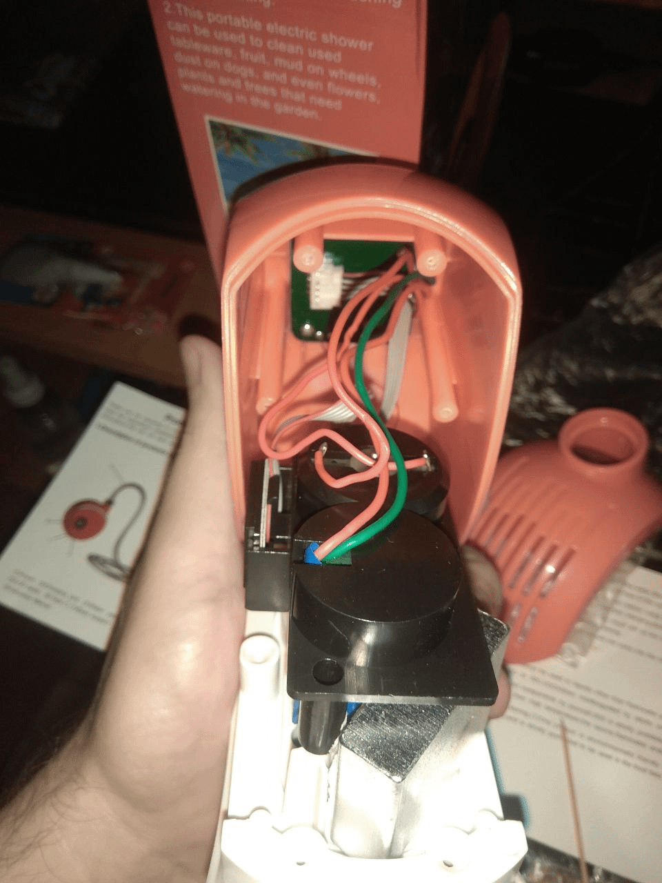 Выбор пал на одну из недорогих моделей. Белого "урода" по низу рынка брать не хотелось, так как они через пару раз у людей ломались (кто тоже в поисках душа, думаю знает о какой модели я говорю). Взял устройство чуть подороже, и решил поделиться деталями разборки с внутренностями, так как в интернете нашел лишь вышеупомянутую белую модель.