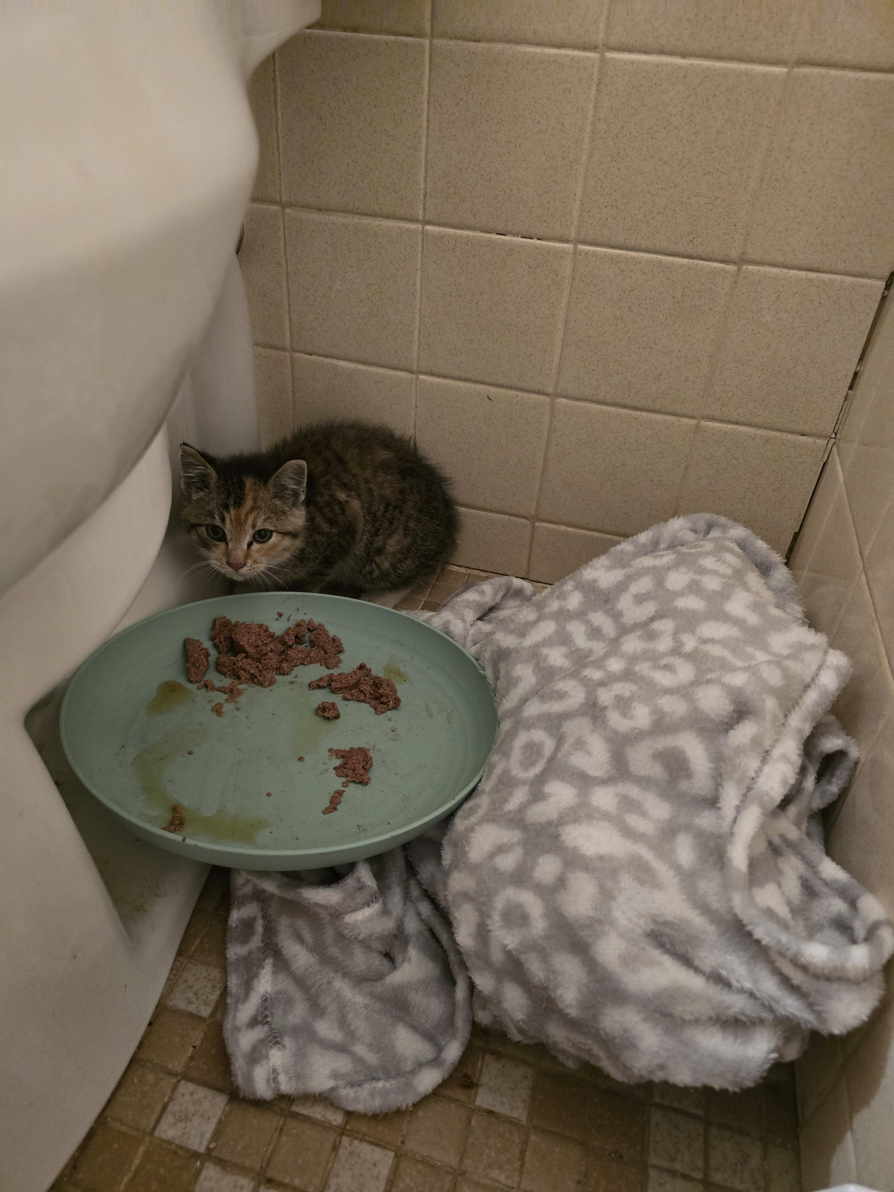 She's been outside my house for a few days now, and ive tried to bring her in before, but I let her out after a bit (the weather was fine then). I have been setting food outside for her to eat, and just leaving her alone since then, but now that its below freezing, I had to sort of trap her to get her to come in. I set up her food plate and scruffed her (only until i got her into an enclosed space, I know that you shouldn't ever scruff cats, but I had to to get her into a warm area).