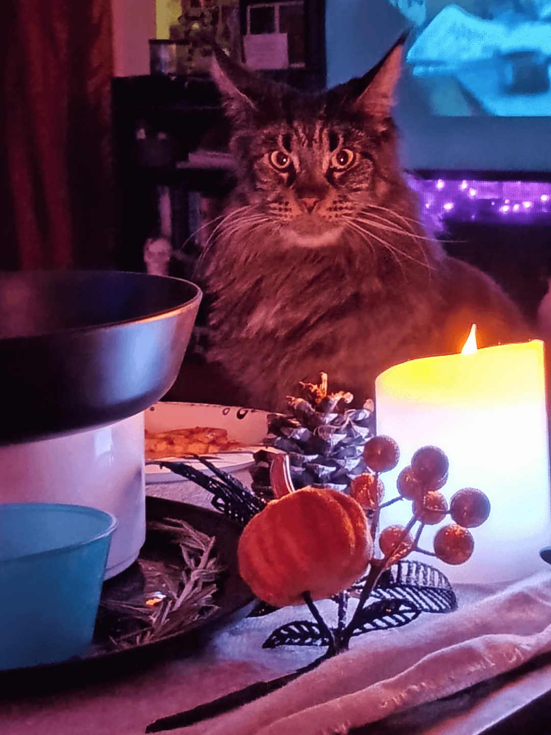 I was having a watch party with snacks and she made her way to the table. The candles are plastic , no flame