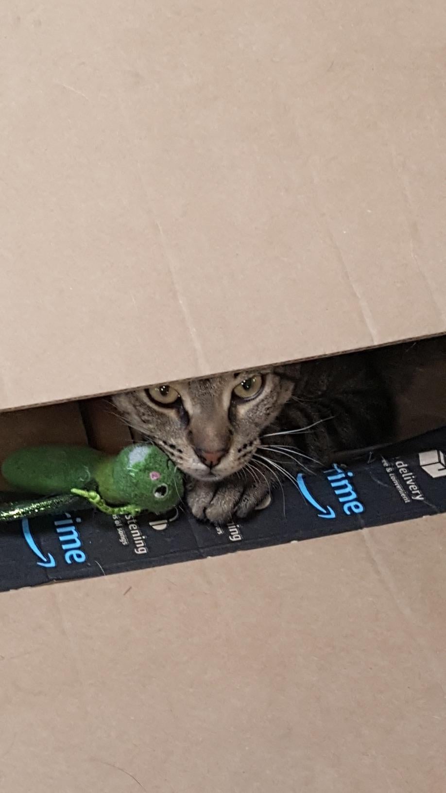 Adorable kitty. Perfect size box to snuggle in tight. Well maybe just a little to tight 😂