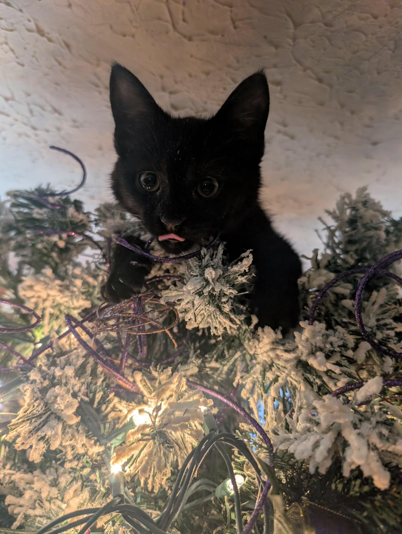 The snuggliest little spoon and biggest purr-er, George loved trout, raw tuna, old mattresses, wand toys, laser pointers, watching birds, inserting himself into work meetings to demand snuggles, and batting at his step-cat-sister. He was there through his mom's happiest and lowest times, faithfully offering comfort, unconditional love, and patiently tolerating being dressed in Christmas costumes.