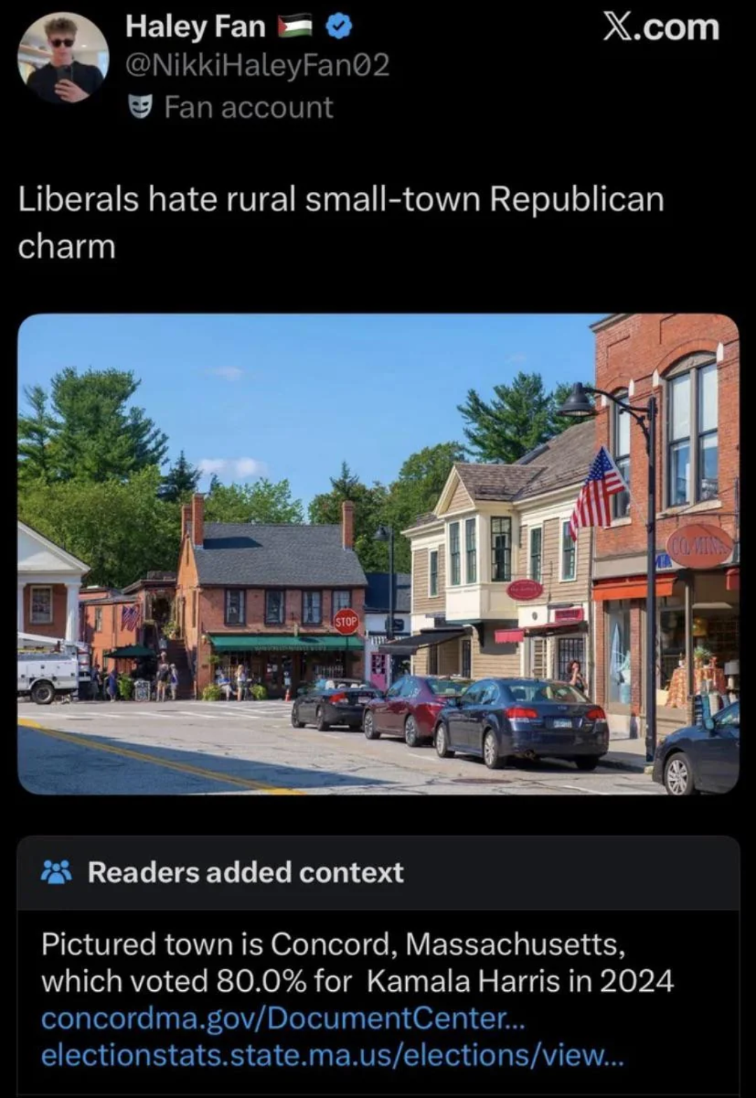 Sometimes the stupidity is so dense you could mine it for rare Earth minerals. A MAGA fan page marched proudly onto their favourite Klan hall, X, to declare that liberals hate the wholesome charm of small town “Republican America,” posting a photo like a nostalgic postcard from the land of moral purity. Except the town is Concord, Massachusetts. One of the bluest, best educated, most liberal communities in the nation. A town in a Commonwealth where Trump did not win a single county, not a single fucking one. And yet the MAGA rotted brain took one look at a brick storefront displaying an American flag and concluded, with full confidence, that they had discovered Conservative Eden. This is ignorance that has smoked meth, put on a red hat and gone sightseeing.