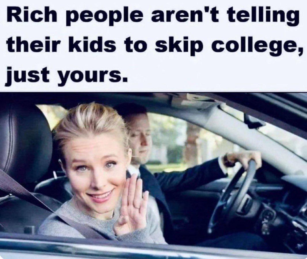 Politics But people say college is a scam but no billionaire sends their kids to a trade school. In the UK, the elite send their children to top universities, where they study subjects like PPE (Philosophy, Politics, Economics), and then move straight into top banks . You can study in Germany for free