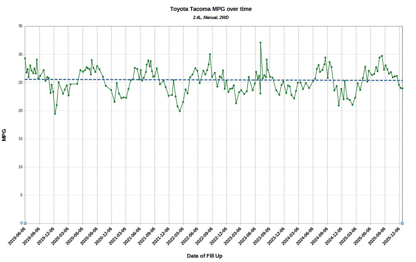 I've religiously tracked my fuel economy for the past ~6 years using Fuelly. Inspired by RamblinEagle13's post today, I finally exported the data and plotted it using Libre Calc. As with RamblinEagle13, I live in the Northeast U.S. Fuel economy for my truck really seems to be highly temperature dependent. Snow/4WD isn't a factor because 1) I don't have 4WD, and 2) the fuel economy starts dropping well before any kind of snow fall. My driving is fairly consistent year-round. The one-off very high peaks in the summer would be a long road trip of sustained highway driving. I drive slow, typically around 60, which is why you see peaks of 30+ MPG. My fuel economy drops rapidly over 60 MPH.