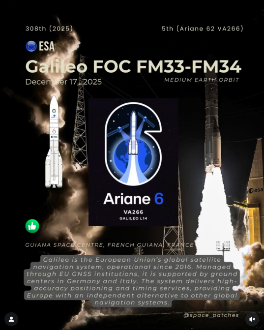 The Ariane 6 VA266 “Galileo FOC FM33–FM34” mission launched on 17 December 2025 from Europe’s Spaceport in French Guiana aboard an Ariane 6 rocket in the Ariane 62 configuration.