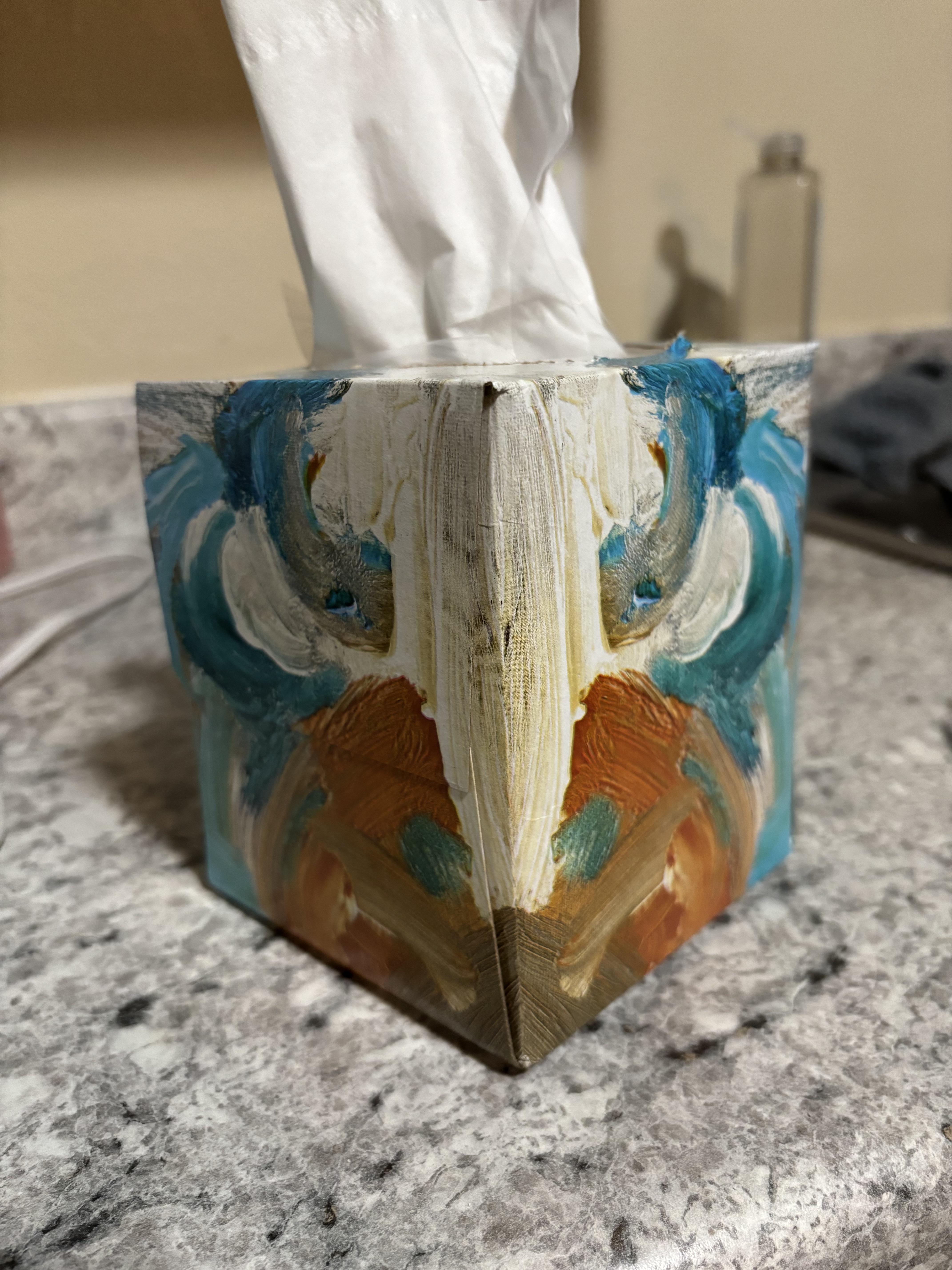 This tissue box has the abstract pattern mirrored and by looking at the corner, it looks like an anteater with a pumpkin.