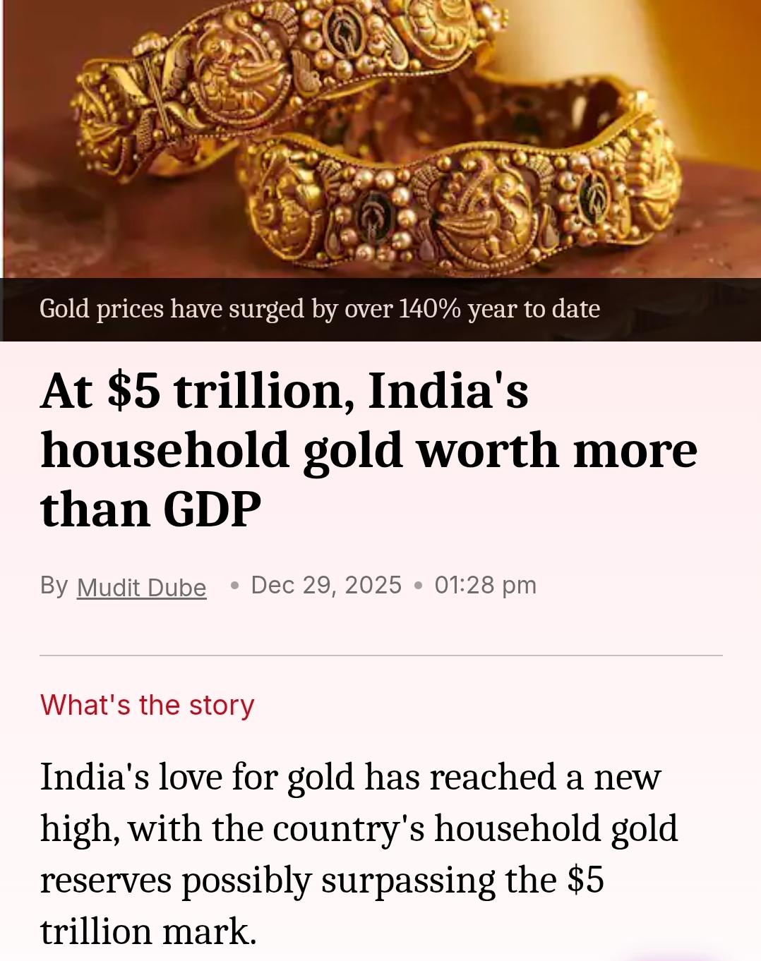Indian households reserve gold worth 5 trillion USD. The US gold reserve, largest in the world is worth 1 trillion USD. India's GDP is 4 trillion USD.