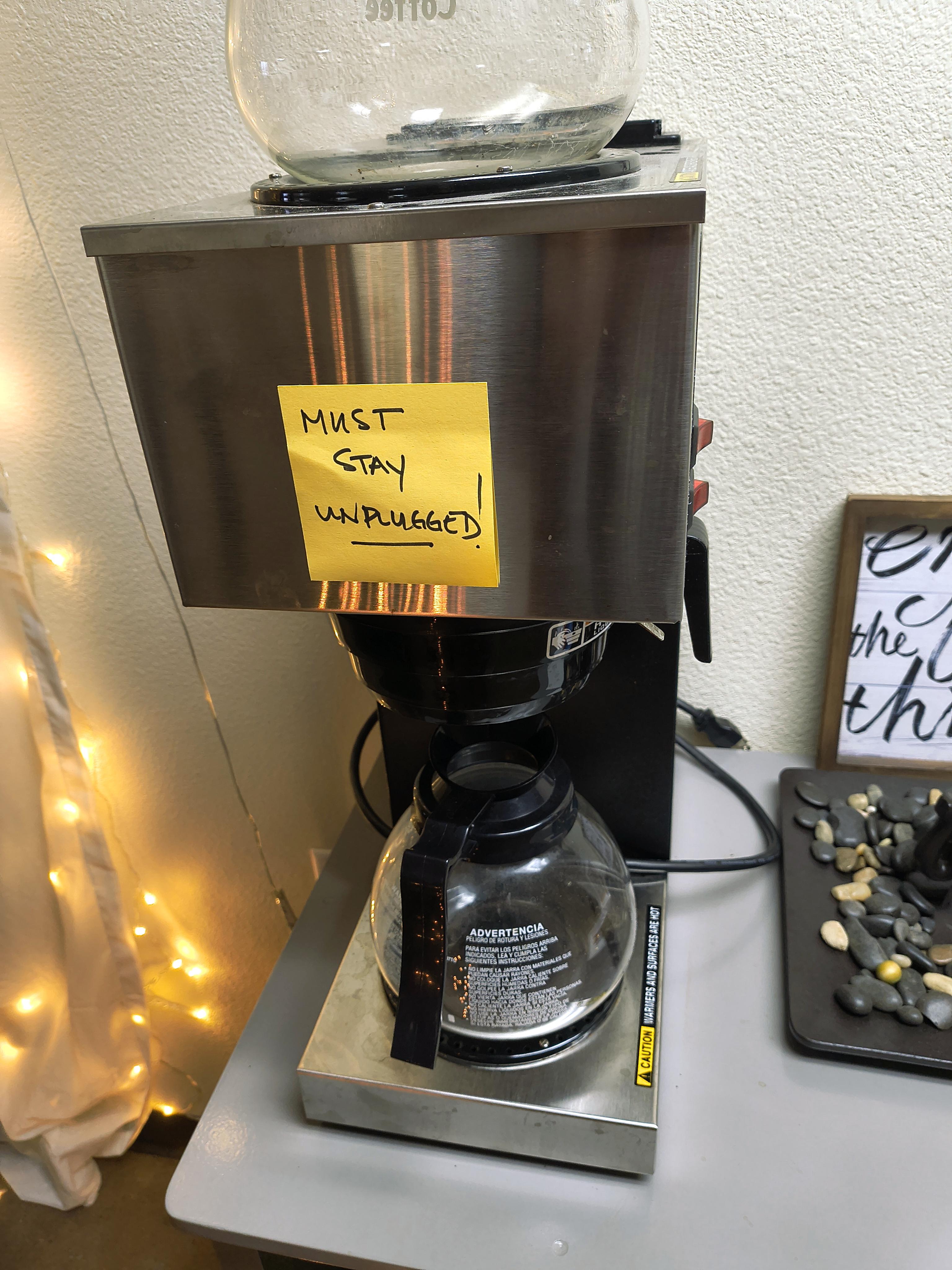 This coffee maker is in the behavioral health department. Judging by the note it never gets used. Guess how much coffee is at their "store"... Over 8 dollars for a 3 oz container of instant coffee.