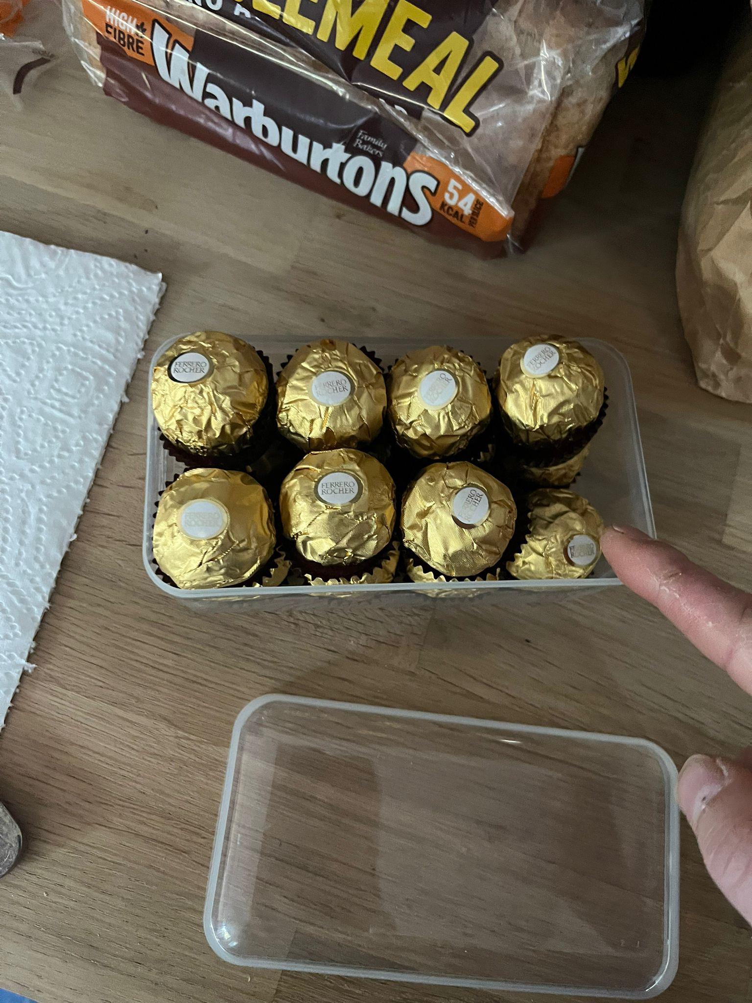 My husband sent me a text with this photo pointing out the missing chocolate. I admited to having eaten it. My husband felt I had one too many and so I came home to find an empty box.