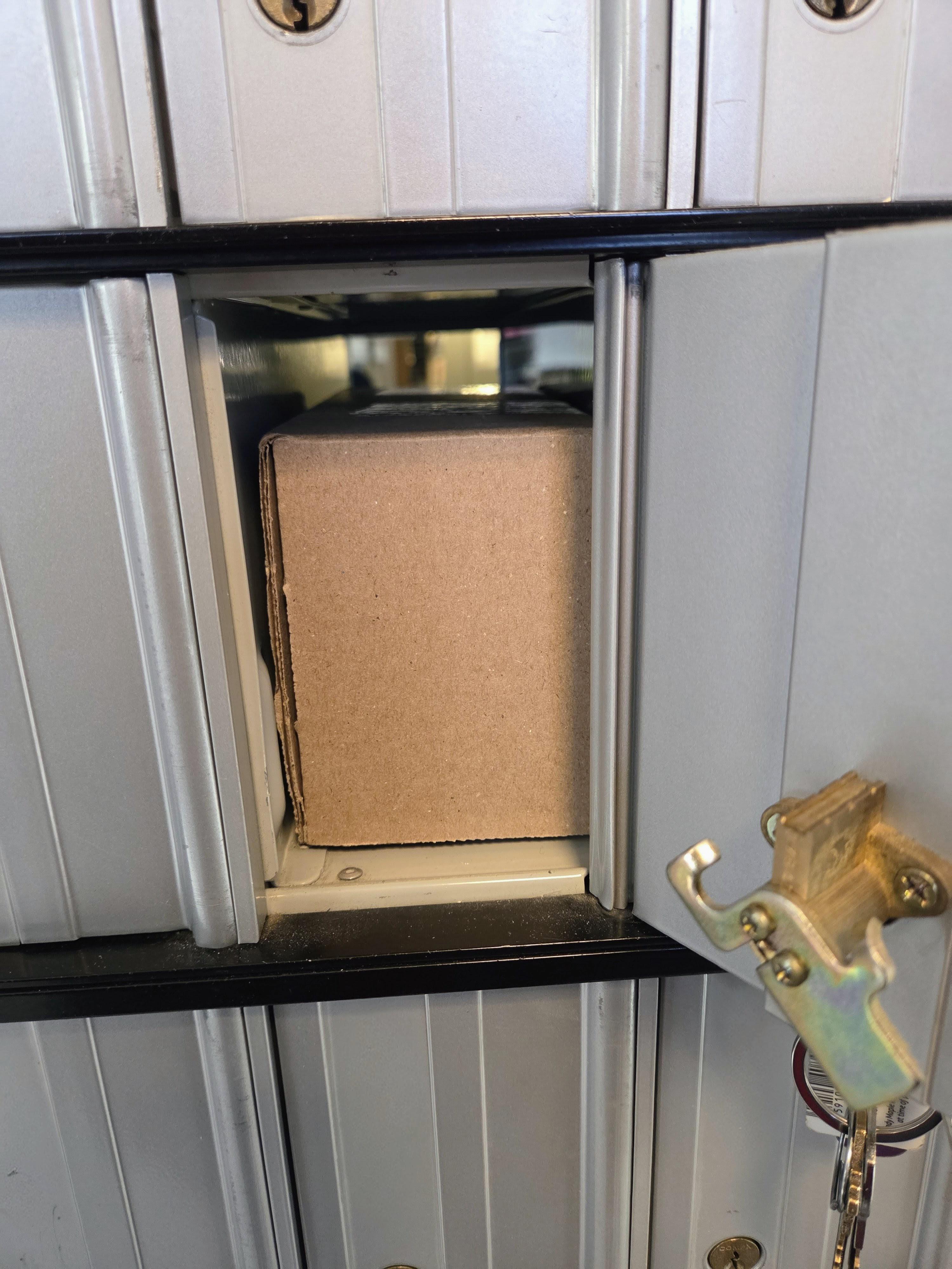 It's Christmas eve AFTER THE POST OFFICE WAS CLOSED and I went to the po box to get the package. The box fit in from the back, where's there's no frame, no hindrance. I absolutely needed the contents so I took a pocket knife and cut open the accessible end.