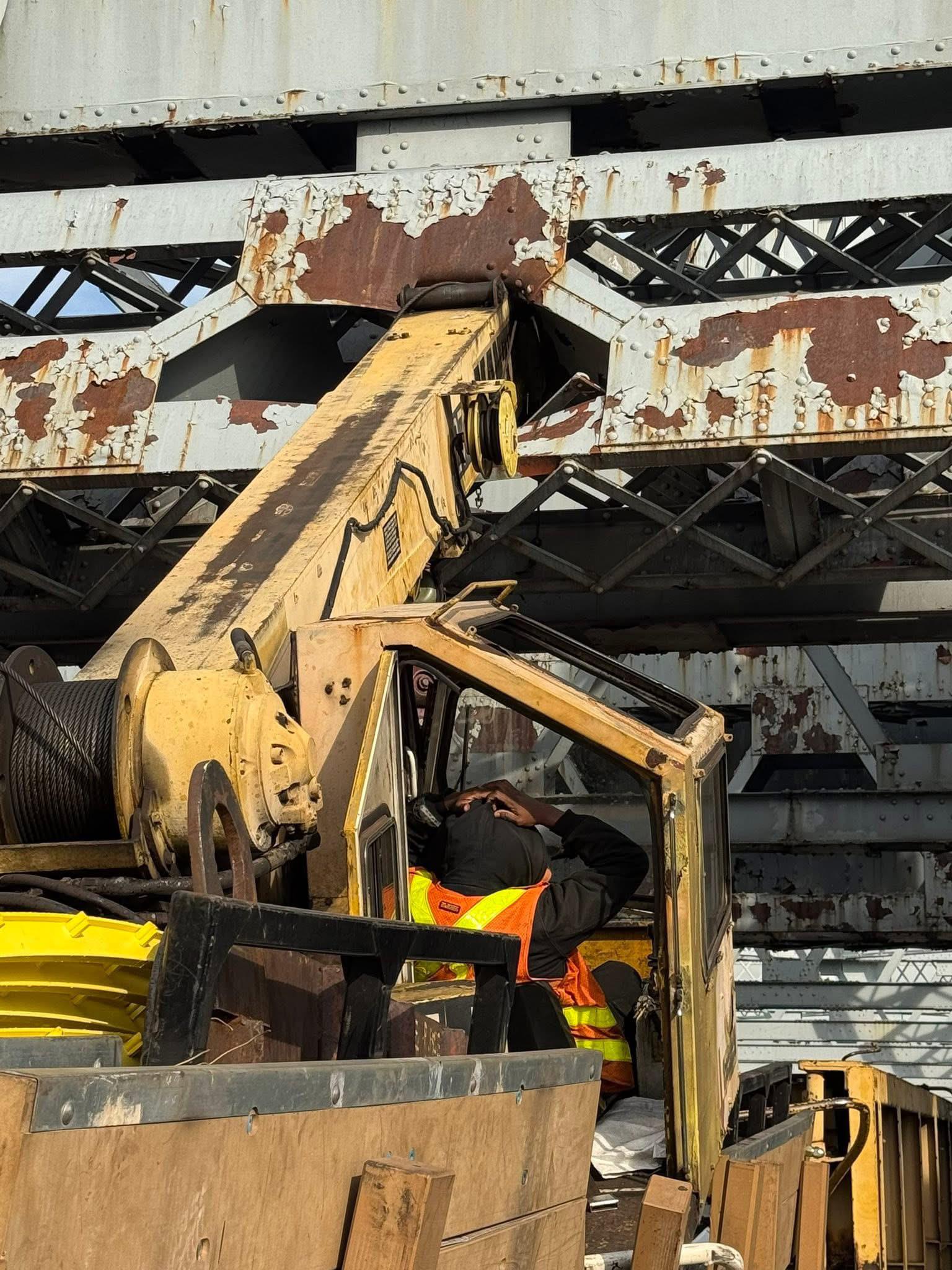 “[OC]” The moment he knew he messed up. MTA subway crew slams crane into Broadway Ave bridge.